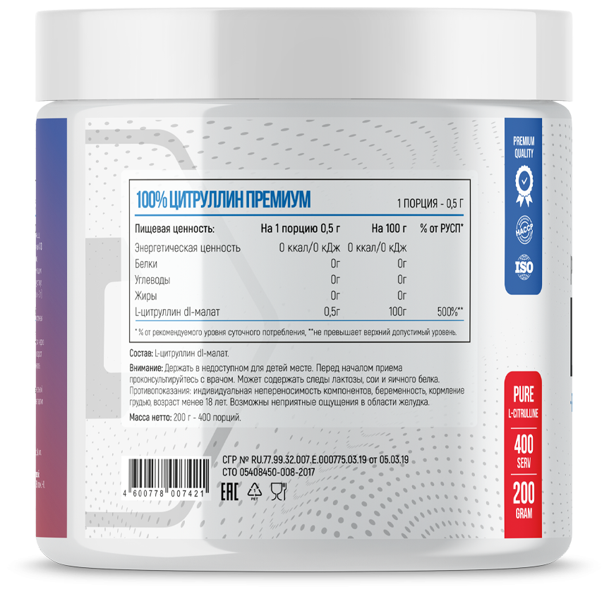 Добавка Citrulline создана на основе одноименной аминокислоты, полученной из натурального сырья и прошедшей многоступенчатую очистку. В ней отсутствуют сторонние примеси, сахар и красители. Каждая порция содержит высокобиодоступный Цитруллин Малата, который быстро усваивается и обладает широким спектром биологических эффектов.