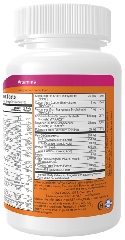 Омега-3 (из концентрата рыбного жира), карбонат кальция (из морских минералов красных водорослей), цитрат и аскорбат кальция, натуральное масло лимона, соевый лецитин, масло бурого риса, пчелиный воск (Е901), оксид магния, магний из морских минералов красных водорослей, цитрат магния, бисглицинат железа, масло из семян бурачника, аскорбиновая кислота, бисглицинат цинка, d-альфа-токоферола ацетат, хлорид калия, d-пантотенат кальция, бисглицинат меди, никотинамид, холина битартрат, инозит, пиридоксина гидрохлорид, бисглицинат марганца, аминохелат хрома, тиамина гидрохлорид, рибофлавин, бета-каротин, фолиевая кислота, аммония молибдат, лютеин, ликопин (из экстракта томатов), биотин, йодид калия, селенометионин, фитоменадион, метилкобаламин, холекальциферол, желатин, глицерин (Е422), вода, камедь рожкового дерева (Е410)
