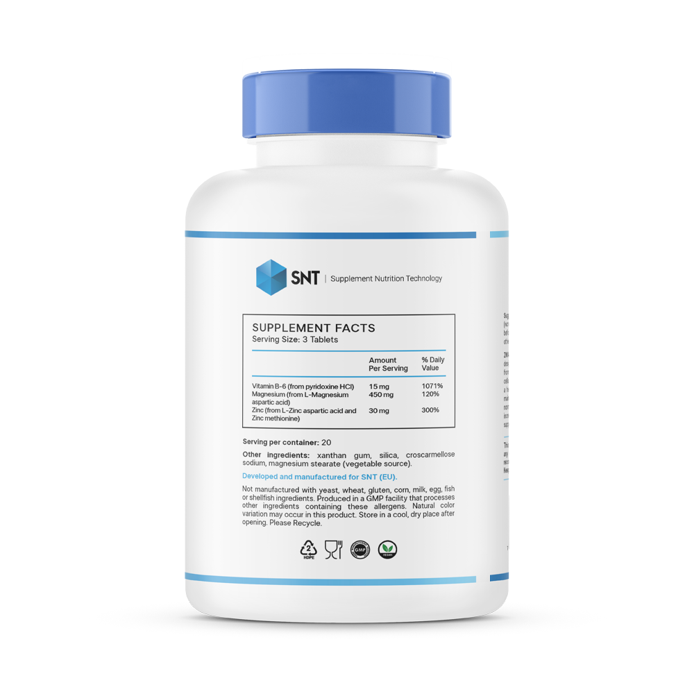 ZMA - комплекс, включающая в себя цинк, магний и витамин B6. Цинк необходим для правильной работы гормональной системы, улучшает выработку тестостерона, укрепляет иммунитет, контролирует жирность кожи. Магний улучшает усвоение цинка, является сильным антиоксидантом, расслабляет нервную систему, играет важную роль в сокращении мышц. Вместе с витамином B6 стимулирует синтез белка в организме.